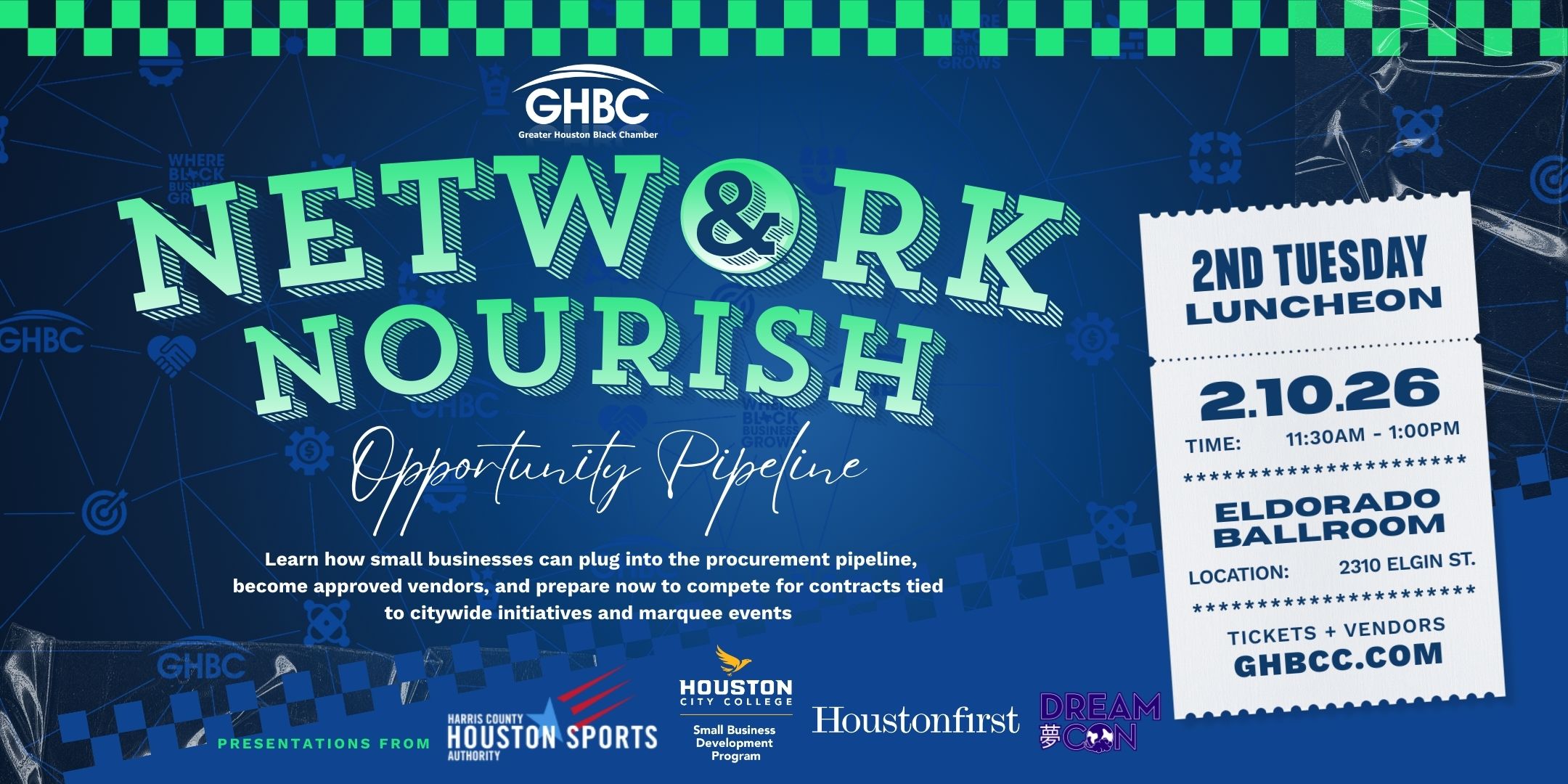 Network & Nourish: 2nd Tuesday Luncheon  "The Opportunity Pipeline: How Houston’s 2026 Events & Projects Can Grow Your Business" Event Overview As Houston prepares for major events, large-scale projects, and increased economic activity, this luncheon will focus on how local and minority-owned businesses can plug into the procurement pipeline, become approved vendors, and prepare now […]